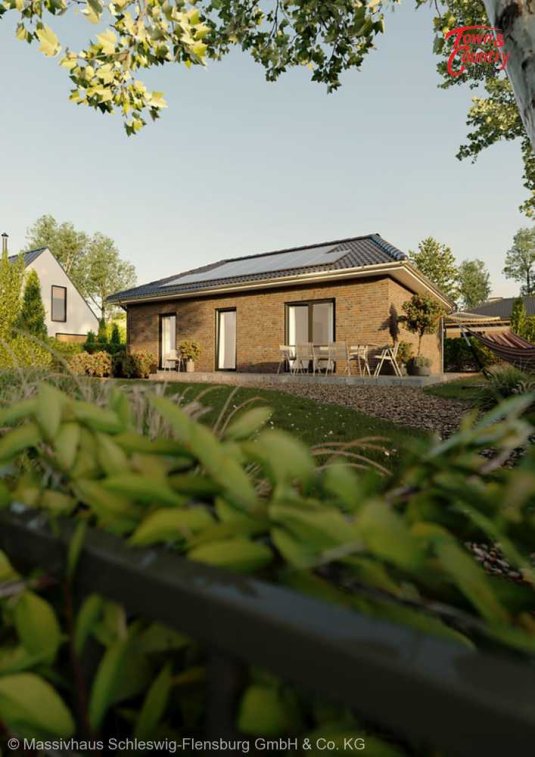 Auf rund 78 Quadratmetern finden Sie dank cleverer Planung ausreichend Platz für die ganze Familie. In den hellen, großzügig geschnittenen Zimmern wohnen Sie auf einer Ebene mit der Natur. Ob Wohnzimmer, Küche oder Schlafzimmer - überall sind Sie nur einen Schritt von Ihrem Garten entfernt.