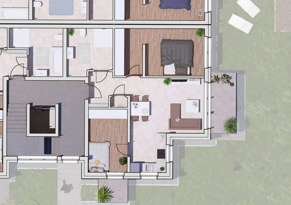 Hochwertige Bodenbeläge: Wohnbereiche werden mit Fliesen und Parkett ausgestattet.