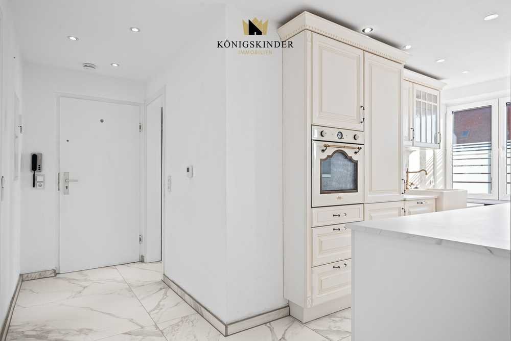 Zur Wohnung gehören ein sehr geräumiger und heller Wohn/Essbereich mit sehr schönem Ausblick in den großen Park, sowie eine neue hochwertige, komplett ausgestattete Küche mit Durchreiche.
