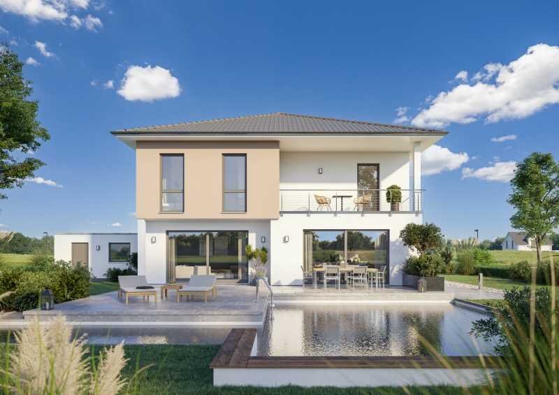 Die Stadtvilla Pallas ist ein wahr gewordener Wohntraum der Moderne. Auf zwei Geschossen finden Sie insgesamt 5 lichtdurchflutete Räume, die dem hohen Anspruch an maximalen Wohnkomfort gerecht werden. Eines der Highlights im Erdgeschoss ist der offene Wohn- und Essbereich, der mit einem Tunnelkamin optisch voneinander getrennt werden kann. Die Küche bietet Platz für eine schöne Kochinsel, die vor allem die Herzen von Hobby-Köchen höher schlagen lässt. Der Eingang zur Speisekammer wird modern als Teil der Küchenfront integriert. Das Erdgeschoss wird komplettiert durch ein Home-Office, ein Duschbad sowie den Hauswirtschaftsraum.