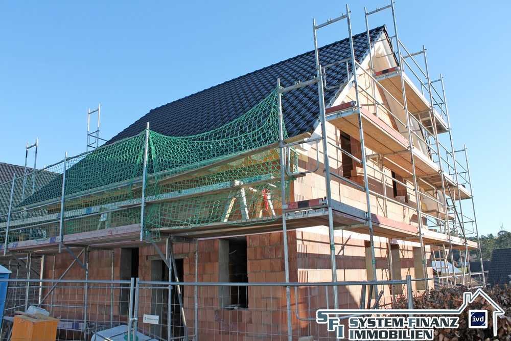 Auf einem 386m² großen Grundstück finden Sie den auf den Bildern zu sehenden erweiterten Rohbau. Die Maurerarbeiten wurden mit wärmedämmenden Porotonsteinen ausgeführt (inkl. Garage), das Satteldach wurde durch eine lokale Zimmerei in Konstruktionsvollholz gefertigt und mit schwarz-matt edelengobierten Tondachziegeln gedeckt. Dachrinnen und Fallrohre wurden bereits installiert und die Dachüberstände sind mit einem weißen Schutzanstrich versehen. Im aktuellen Ausbauschritt wurden die Fenster sowie ein Element mit Hebe-Schiebe-Funktion im Wohnzimmerbereich eingebaut.