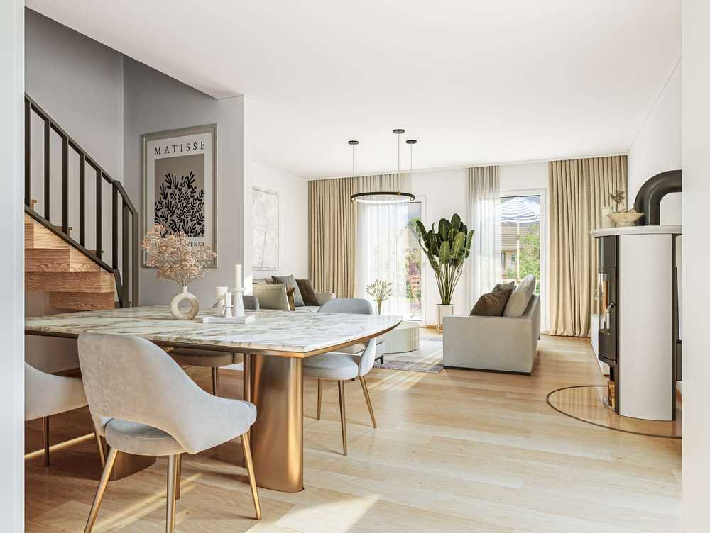 Herzstück des Erdgeschosses ist das helle Wohn-Esszimmer mit direktem Zugang zur sonnigen Terrasse und dem liebevoll angelegten Garten. Ein Kaminofen sorgt hier an kühleren Tagen für eine besonders gemütliche Atmosphäre. Die angrenzende Küche ist praktisch geschnitten und bietet ausreichend Platz für kulinarische Entfaltung. Ein separates Gäste-WC sowie ein Abstellraum runden das Raumangebot im Erdgeschoss ab.
