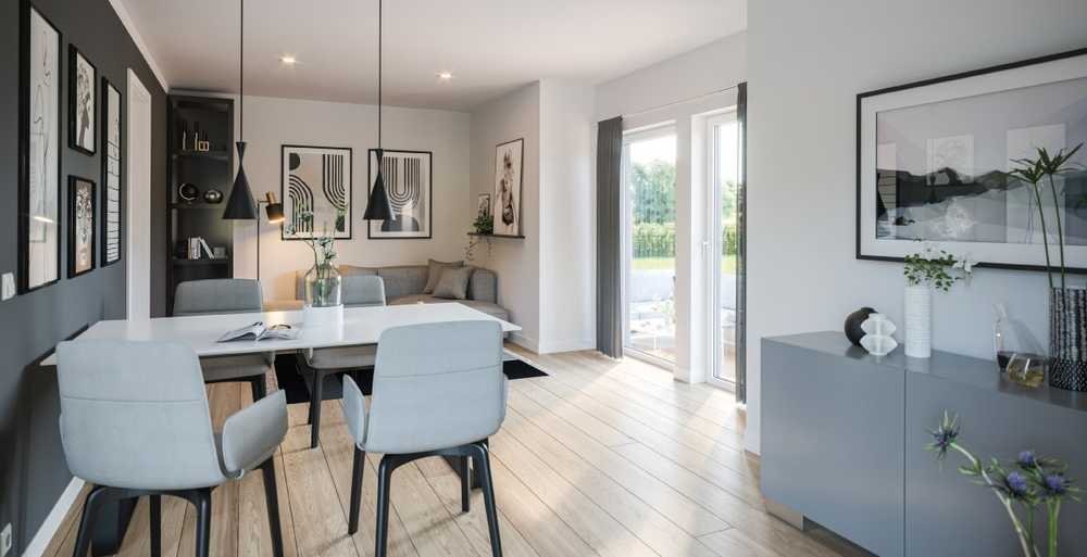 Im Erdgeschoss erwartet Sie ein geräumiges Wohnzimmer mit großen Fenstern, die viel Tageslicht hereinlassen. Die offene Küche bildet das Herz des Hauses und ist ideal für das gesellige Beisammensein. Das Esszimmer bietet Platz für gemeinsame Mahlzeiten und Feierlichkeiten.