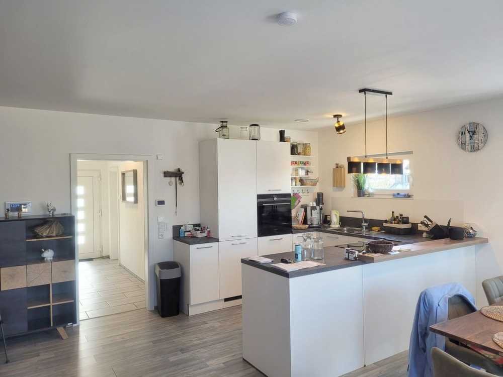 Hier erwartet Sie vielleicht Ihr neues Zuhause? Das Haus wurde im Jahr 2022 nach KfW 55 Standard fertiggestellt. Sie könnten also direkt einziehen, auch mit Ihrer Familie. Hier sollten keine Wünsche offen bleiben. Das Haus befindet sich in einer ruhigen Anliegerstraße und die tolle Aussicht sorgt automatisch für gute Laune, die sich nach Feierabend auf der Terrasse im Garten dann von alleine einstellt., Im Eingangsbereich befindet sich linksseitig ein Gäste-WC. mit Toilette und Waschbecken. Daneben befindet sich der Hauswirtschaftsraum, der auch als Speisekammer genutzt werden kann. Rechtsseitig kommt man in den Heizungsraum, in dem sich eine moderne Luft-Luft-Wärmepumpe befindet. Hier haben Sie auch direkten Zugang zu der Doppelgarage mit elektrischem Tor, in der sich auch eine Ladestation für ein E-Auto befindet. Eine Photovoltaikanlage ist ebenfalls vorhanden. Im hinteren Eingangsbereich des Erdgeschosses kommen Sie in die offene Küche mit Wohn-und Esszimmer. Das großzügige Wohnzimmer ist mit einem Kaminofen ausgestattet, der für wohlige Wärme sorgt. Vom Essbereich aus kommen Sie auch direkt in den großen Garten mit Terrasse. Vom Erdgeschoss aus führt eine Echtholztreppe in das Obergeschoss, das mit mehreren Räumen ausgestattet ist. Hier findet sich Platz für ein Büro, das auch als weiteres Schlafzimmer genutzt werden könnte. Zudem befindet sich ein weiteres Kinderzimmer, ein Ankleidezimmer und ein Schlafzimmer auf der Etage. Das moderne Badezimmer mit begehbarer Dusche, Badewanne, Doppelwaschtisch und Toilette rundet das Angebot ab. Kameraüberwachung der Klingelanlage ist auf beiden Geschossen vorhanden, so das Sie schon vorher wissen, wer Sie besucht. Elektrische Rollläden und dreifach verglaste Fenster sowie ein Fluchtfenster sind ebenfalls vorhanden. Warten Sie also nicht allzu lange mit Ihrer Kaufentscheidung, das Anwesen mit toller Aussicht und modernem Stil mit einer hochwertigen Küche kann nur einmal verkauft werden.