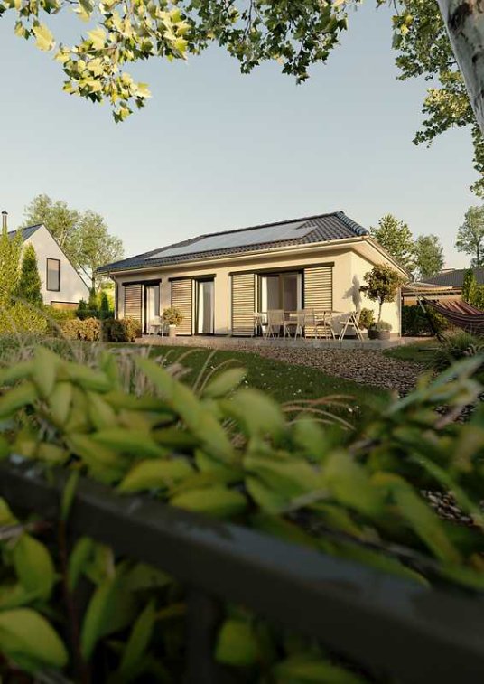 Auf rund 78 Quadratmetern finden Sie dank cleverer Planung ausreichend Platz für die ganze Familie. In den hellen, großzügig geschnittenen Zimmern wohnen Sie auf einer Ebene mit der Natur. Ob Wohnzimmer, Küche oder Schlafzimmer – überall sind Sie nur einen Schritt von Ihrem Garten entfernt.