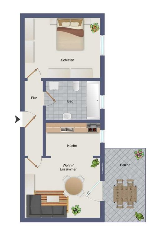 Die Wohnfläche von ca. 46,77 m² teilt sich auf in Flur, Wohnzimmer mit Zugang zur offen begehbaren Küche und dem überdachten Südostbalkon, Schlafzimmer und das Badezimmer.