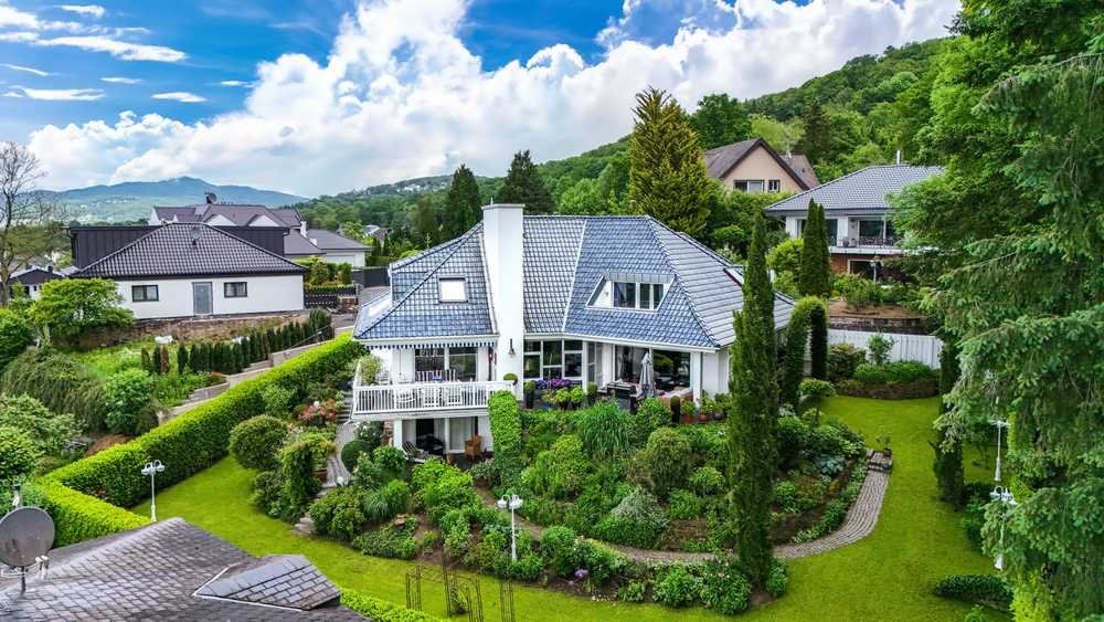 Am höchsten Punkt eine sehr begehrten Anliegerstraße in Unkel-Scheuren, diskret an einer "Cul de sac" gelegen, befindet sich dieses elegante Domizil. Treten Sie ein: Ein traumhafter, professionell angelegter Garten mit mediterran anmutender Bepflanzung wird Ihre Aufmerksamkeit sicher unmittelbar auf sich ziehen. Egal wohin Ihre Blicke wandern, hier wurde mit sehr viel Liebe zum Detail ein Gartenparadies erschaffen. Es bietet den perfekten "Bilder"-Rahmen für unterschiedlichste Blickachsen, ob ins Rheintal, in die benachbarten Gärten oder auch ins angrenzende Naturschutzgebiet. Lassen Sie uns ins Haus gehen! Ein einladender Eingangsbereich mit weißer Glastür und Granitboden sowie Gäste-WC verbindet den Wohnbereich im Erdgeschoss mit dem Zugang zur möglichen Einliegerwohnung. Im Kaminzimmer angekommen, würden Sie sich gern verweilen, doch lassen Sie uns vorerst die Chef’s Küche mit individueller Sitzecke und Panoramafenster besichtigen. Hier ist sicher bald der Mittelpunkt des täglichen Lebens. Wenn nicht im Garten, empfangen Sie Ihre Gäste bestimmt im "Dining"-Bereich mit weiteren Panoramafenstern. Auch von hier ist der direkte Zugang auf die Sonnenterrasse möglich. Natürlich gibt es noch ein weiteres Wohnzimmer. Über eine stilvolle Treppe gelangen Sie ins Obergeschoss. Die Galerie öffnet den Blick in den Garten und lässt viel Licht ins Innere des Hauses. Herzstück ist das Master-Schlafzimmer mit Balkon, einer integrierten Ankleide und einem ganz besonderen Marmorbad. Die Einliegerwohnung befindet sich im Unter- bzw. Gartengeschoss des Hauses. Hobbyräume und ausreichend Stauraum gehören natürlich ebenfalls zu einem Haus dieser Kategorie. Die Doppelgarage – mit einer Wallbox ausgestattet – lässt auch die Unterstellung größerer Modelle zu, ansonsten gibt es ausreichend Parkmöglichkeiten vor der Garage oder auch auf dem Grundstück. Der Garten verfügt über ein integriertes Bewässerungssystem, ist professionell illuminiert und mit Soundboxen ausgestattet. Dieses Anwesen vereint Luxus, Ruhe und Natur in Perfektion! Lassen Sie sich inspirieren.