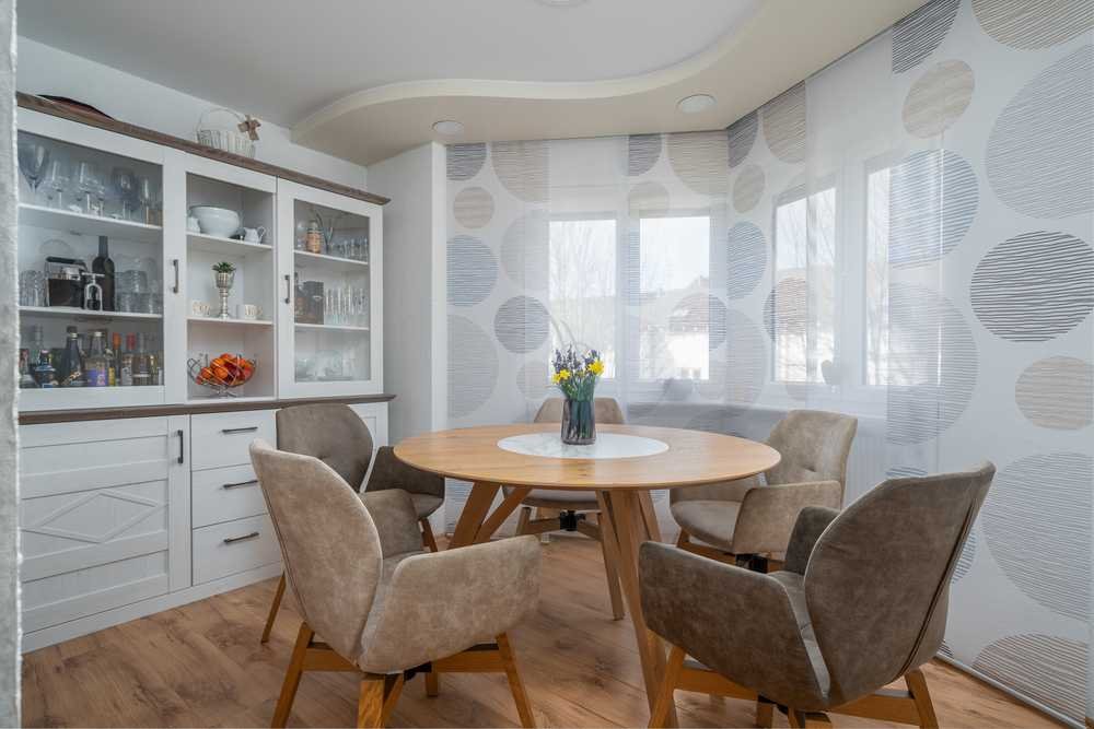 Betreten Sie den Flur, so gelangen Sie geradeaus über einen Garderobenbereich direkt ins Wohnzimmr mit Zugang zum überdachten West-Balkon. Durch eine charmante Eckllösung gelangen Sie von hier in den offenen Essbereich, der sich in einem Ercker befindet. Gegenüber des Erkers befindet sich geschützt und doch offen zugänglich die Küche.