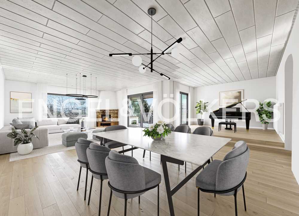 Der Hauptteil des Hauses verfügt über ca. 160 m² Wohnfläche und besticht mit einem gut durchdachten Grundriss. Der helle Wohn-Essbereich mit großen Fensterfronten wird durch einen offenen Kamin bereichert, der eine behagliche Atmosphäre schafft. Hier passt eine ausladende und gemütliche Sofalandschaft hinein und erlaubt der ganzen Familie, bei geselligem Beisammensein das Feuer zu genießen. Gespiegelt wird der Kamin auf der angrenzenden Terrasse, sodass auch an kälteren Abenden der herrliche Blick in den Garten begeistern wird.