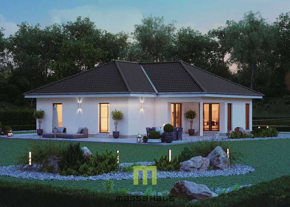 Ihr neues Eigenheim! Ein Bungalow, der Freiluftliebhabern und Komfortsuchenden gleichermaßen gerecht wird. Auf ca. 138 m² Nettogrundfläche entfaltet sich ein Wohntraum, der Individualität und Wohlbefinden in den Vordergrund stellt. Das besondere an diesem attraktiven Walmdach-Bungalow ist seine rechtwinklig versetzte Konzeption, die sowohl einen überdachten Sitzplatz als auch eine angrenzende Freiterrasse bietet - ideal für entspannte Stunden im Freien, egal ob bei Sonnenschein oder warmem Regen. Im Inneren des Hauses erwartet Sie ein offen gestalteter Wohn-, Ess- und Küchenbereich, der als Herzstück des Hauses dient. Zusätzlich bietet der Bungalow ausreichend Platz für ein Duschbad, ein großes Badezimmer sowie zwei großzügige Kinder- und ein Elternzimmer. Der ComfortStyle - wo das Leben drinnen und draußen gleichermaßen genossen wird.