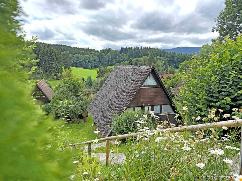 Das Haus steht an einem leichten Südhang und wurde, wie die anderen Häuser auch, in Holzständerbauweise um das Jahr 1972 erbaut. Im Erdgeschoss befinden sich ein Schlafzimmer, ein Bad mit Fenster, Dusche und Waschmaschinenanschluss eine offene Küche mit Einbauküche und ein gemütliches Wohnzimmer mit großer Glasfensterfront nach Süden. Dem Wohnzimmer vorgelagert befindet sich ein terrassenartiger, großer Holzbalkon mit freier Sicht ins Grüne und sogar etwas Bergblick.