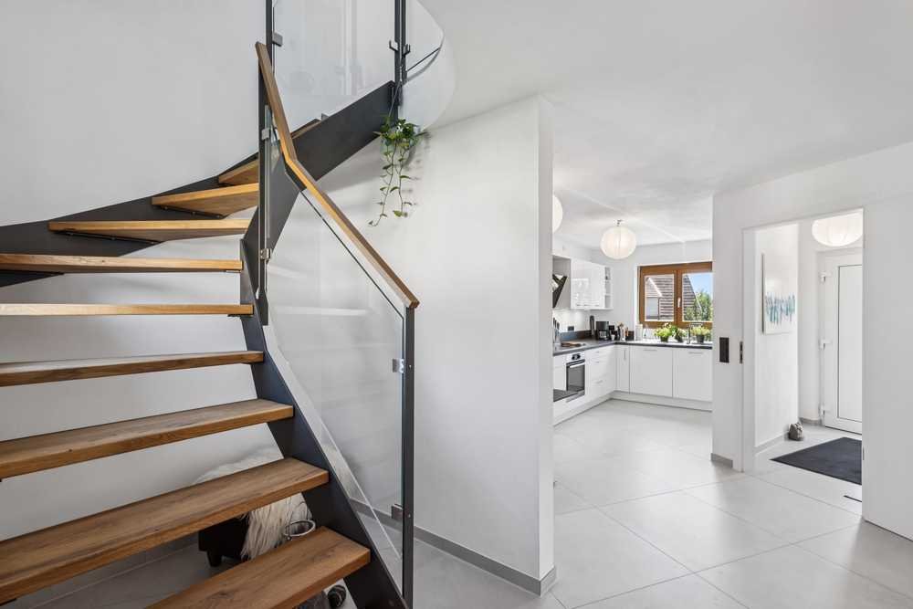 Bereits beim Betreten dieses außergewöhnlichen Hauses spüren Sie: Hier wurde an alles gedacht. Die eigene Außentreppe führt Sie zur eleganten, anthrazitfarbenen Eingangstür. Dahinter erwartet Sie der Eingangsbereich mit einem deckenhohen Einbauschrank, der nicht nur Platz für Ihre Garderobe bietet, sondern auch Ihre neue Gasetagenheizung clever integriert.