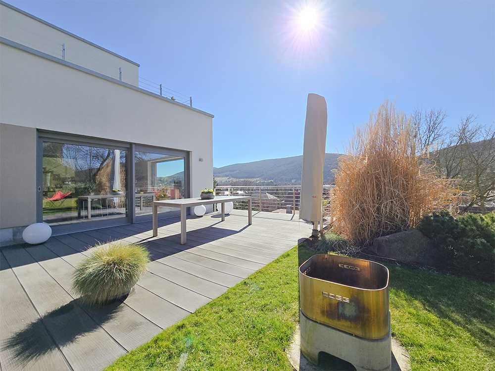 Diese außergewöhnliche Villa im Bauhausstil aus dem Jahr 2015 vereint moderne Technik mit stilvollem Design und höchstem Wohnkomfort. Auf ca. 224 m² Wohnfläche, zzgl. Nutzfläche und einem großzügigen Grundstück von ca. 1.214 m² bietet diese ein exklusives Zuhause für höchste Ansprüche. Die Außenwände wurden mit dem Klimapor-Wandsystem errichtet, wodurch zu jeder Jahreszeit ein angenehmes Raumklima gewährleistet ist. Im Erdgeschoss erwartet Sie ein großzügiger, atelierartiger Eingangsbereich mit Occhio-Leuchten und durchdachten Einbaulösungen. Ergänzt wird diese Ebene durch einen Hauswirtschaftsraum mit Gartenzugang sowie zwei praktische Abstellräume. Die barrierefreie Raumplanung wird durch einen Aufzug ergänzt, der alle Etagen erschließt. Zusätzlich verbindet ein offen gestalteter Treppenaufgang mit wärmeschutzverglastem Lichtband die Ebenen. Das Herzstück des Hauses befindet sich im ersten Obergeschoss: Ein lichtdurchfluteter Wohnbereich mit Kamin, eine exklusive Markenküche mit weißen Hochglanzfronten, Kochinsel, hochwertigen Miele-Geräten sowie einem Frühstückstresen aus amerikanischem Nussbaum schaffen ein stilvolles Ambiente. Der Essbereich mit Platz für bis zu acht Personen bietet Zugang zur Terrasse und einen herrlichen Ausblick durch das große Panoramafenster. Ein separater Vorratsraum mit Einbauschränken sorgt für zusätzlichen Stauraum. Ebenso auf dieser Etage: ein Panorama-Schlafzimmer mit Blick in die Natur, eine großzügige Ankleide mit Tageslicht und maßgefertigten Einbauschränken sowie ein hochwertig ausgestattetes Bad mit ebenerdiger Dusche. Im zweiten Obergeschoss lädt der Wellnessbereich mit großer Panoramasauna, luxuriösem Bad, Ruheraum mit Kamin und Einbaubücherschrank zur Entspannung ein. Eine weitere Terrasse eröffnet einen einzigartigen Blick über das Schwarzatal, die Dächer der Stadt und die umliegenden Wälder. Gästezimmer und Gästetoilette runden das Raumangebot ab. Bei der Planung des Hauses wurde besonders auf eine barrierefreie und altersgerechte Ausstattung geachtet. Dieses Haus verbindet Eleganz mit durchdachter Funktionalität und bietet dank seiner komfortablen Ausstattung höchsten Wohnkomfort – heute wie auch in Zukunft. Das Grundstücks- und Garagentor lassen sich per Fernbedienung öffnen, während der schwellenfreie Zugang vom Eingangsbereich und der Garage in alle Wohnbereiche mühelos gelingt. Ein moderner Aufzug, der beide Wohnebenen verbindet und mit einem Notruf-Telefon ausgestattet ist, garantiert zusätzliche Sicherheit. Breite Türen und großzügige Bewegungsflächen verleihen dem gesamten Haus ein offenes, repräsentatives Raumgefühl. Der Wohn- und Schlafbereich ist geschickt auf einer Ebene konzipiert, wodurch kurze Wege und uneingeschränkte Bewegungsfreiheit gewährleistet sind. Extragroße, ebenerdige Duschkabinen unterstreichen den luxuriösen und barrierefreien Anspruch der Badezimmer. Für zeitgemäßen Komfort sorgt zudem eine stabile WLAN-Abdeckung in allen Räumen, sodass Arbeiten, Wohnen und Entspannen perfekt miteinander harmonieren. Zur hochwertigen Ausstattung zählen darüber hinaus Außentüren mit Fingerscan-Öffnung, eine Alarmanlage mit Videoüberwachung, automatisierte Außenjalousien, Holzfenster mit Aluverkleidung, edle Schiefer- und Eichenholzböden sowie Muschelkalk am Haussockel. Die Doppelgarage bietet Platz für zwei Fahrzeuge. Der modern gestaltete Garten überzeugt mit Cortenstahl-Elementen, automatischer Bewässerung über Zisterne und Tiefbrunnen sowie einem Mähroboter. Bei der Planung wurde großer Wert auf stilistische Klarheit, langlebige Materialien, durchdachte Lichtführung und intelligente Stauraumlösungen gelegt.