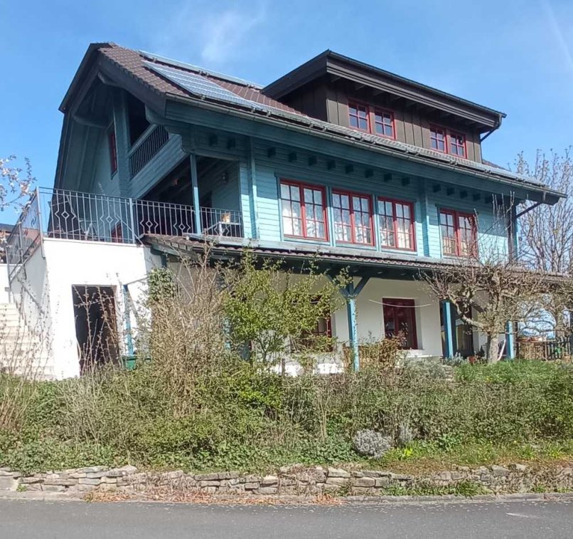 Es handelt sich um ein freistehendes und gedämmtes finnisches Blockhaus aus dem Jahr 1994 mit Einliegerwohnung und Garage.