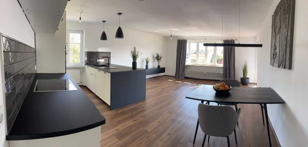 Die Wohnung sowie Garage wurden 2019-2022 aufwendig modernisiert. Der großzügige und offen gestaltete Wohn- und Essbereich mit rund 39 m² bildet das Herzstück der Wohnung. Große Fensterflächen sorgen den ganzen Tag über für eine helle, freundliche Atmosphäre. Die moderne Einbauküche mit stilvoller Kochinsel ist nicht nur ein echter Hingucker, sondern auch funktional und durchdacht eingerichtet – perfekt für alle, die gern kochen und Gäste empfangen. Ein vom Wohnzimmer und Arbeitszimmer zugänglicher überdachter Südbalkon erweitert den Wohnraum ins Freie und lädt zum Entspannen in der Sonne ein. Das Schlafzimmer liegt auf der kühlen Nordseite des Hauses und bietet dadurch auch an warmen Tagen ein angenehm frisches Raumklima. Ein maßgefertigter Einbauschrank mit praktischen Schiebetüren ist bereits integriert und bietet viel Stauraum. Das dritte Zimmer eignet sich hervorragend als Arbeits- oder Kinderzimmer.