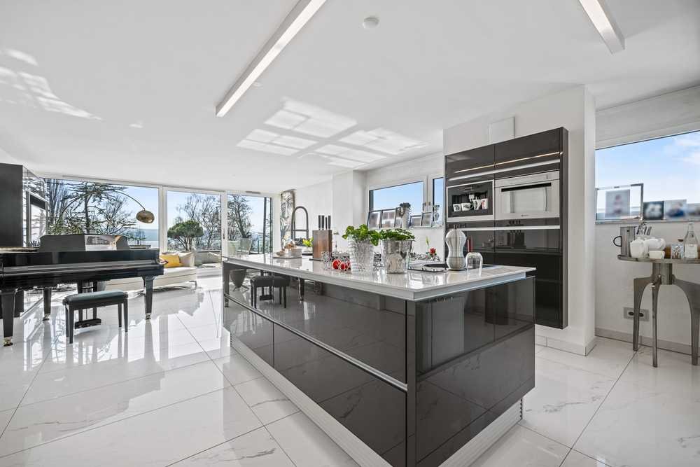 Dieses Penthouse auf zwei Etagen zeichnet sich durch die fantastische und geschmackvolle Ausstattung sowie hochwertige Materialien aus. Das Herzstück dieser eleganten Maisonette-Wohnung ist der großzügige und lichtdurchflutete Wohn-und Essbereich mit offener Küche im Dachgeschoss. Von hier aus blickt man auf den Bodensee sowie die Alpen und betritt den großzügigen, nach Südwesten ausgerichteten Balkon. Einzigartig ist das stilvolle Badezimmer mit einer freistehenden Badewanne und direkter Sicht auf den Bodensee, welches durch eine Glaswand von der Küche abgetrennt ist. Integrierte Jalousien bieten bei Bedarf den nötigen Sichtschutz. Eine Wohnebene tiefer liegt das Hauptschlafzimmer mit begehbarer Ankleide sowie ein weiteres Tageslichtbadezimmer mit Dusche. Des Weiteren gibt es hier ein großes Zimmer, welches sich dank einer ausziehbaren Wand in zwei Zimmer teilen lässt. Von hier aus hat man Zugang auf den zweiten, ebenfalls südwestlich ausgerichteten Balkon mit Seesicht. In einem angrenzenden Zimmer sind bereits Anschlüsse für eine zusätzliche Küche vorhanden, falls diese benötigt wird. Besonders praktisch ist der Abstellraum mit Waschmaschinenanschluss in der Wohnung. Beide Stockwerke sind sowohl über eine Treppe, als auch über den Aufzug barrierefrei erreichbar. Ein Tiefgaragenstellplatz und ein Kellerraum runden den Komfort ab. Der Hausgemeinschaft steht zusätzlich ein Waschkeller sowie ein Fahrradraum zur Verfügung.