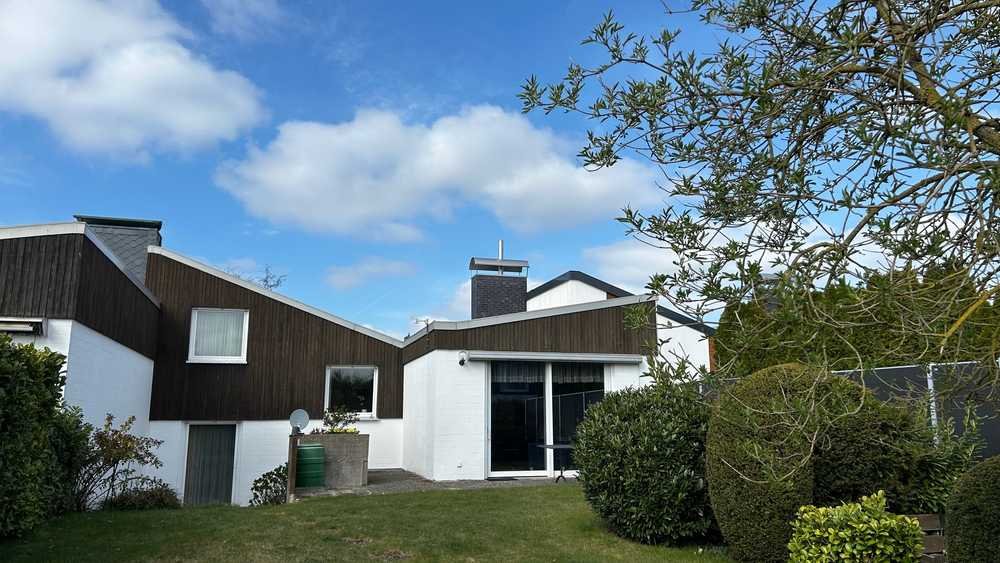 Auf 433 m² Grundstück wurde 1976 dieser nicht alltägliche Kettenbungalow errichtet. 149 m² Wohnfläche bieten einen großzügigen Wohn-Ess-Bereich, Küche, 4 Schlafzimmer, 2 Bäder und Gäste-WC teilweise in leicht versetzten Ebenen. Im Keller ist Platz für Hauswirtschaft und Hobby. Das Grundstück ist als pflegeleichter Ziergarten angelegt. Vor und hinter dem Haus gibt es eine Rasenfläche mit hübscher Randbepflanzung. Eine große Terrasse lädt zum Relaxen ein. Die Duplex-Garage für 2 PKW befindet sich auf dem nahe gelegenen Garagenhof.