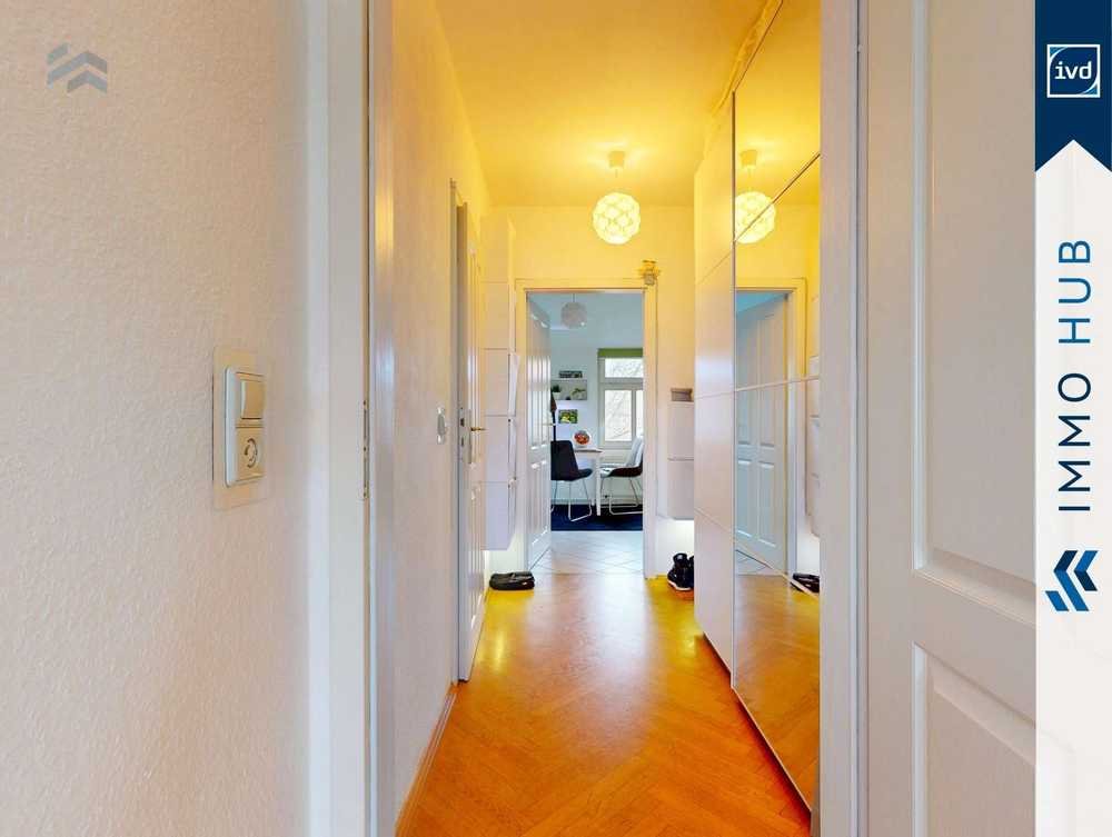 Auf ca. 40 m² erwartet Sie eine durchdachte Raumaufteilung: Über den einladenden Flur sind alle Räume bequem erreichbar. Direkt rechts befindet sich die großzügige Küche, die mit weißen Fliesen zeitlos gestaltet ist. Geradeaus gelangen Sie ins Badezimmer, das mit einer Badewanne und einem Waschmaschinenanschluss ausgestattet ist. Zusätzlich bietet ein praktischer Abstellraum wertvollen Stauraum. Der helle Wohn- und Schlafbereich besticht durch edles Fischgrätparkett und schafft eine gemütliche Atmosphäre.