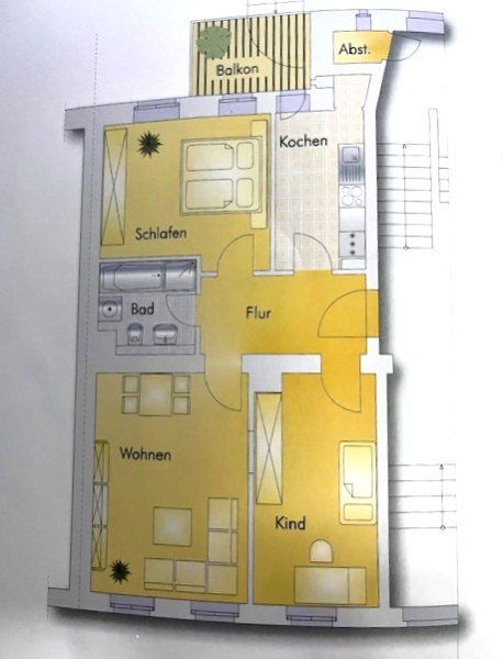 Die EG-Wohnung versprüht viel Charme. Die drei einladenden Zimmer können Sie nach Ihrem persönlichen Geschmack einrichten. Eine Besonderheit ist, dass es nicht nur einen Balkon gibt, sondern Sie auch den Garten am Haus zu Ihrer Erholung nutzen können. Der Balkon ist mit dem Garten durch eine Treppe verbunden.
