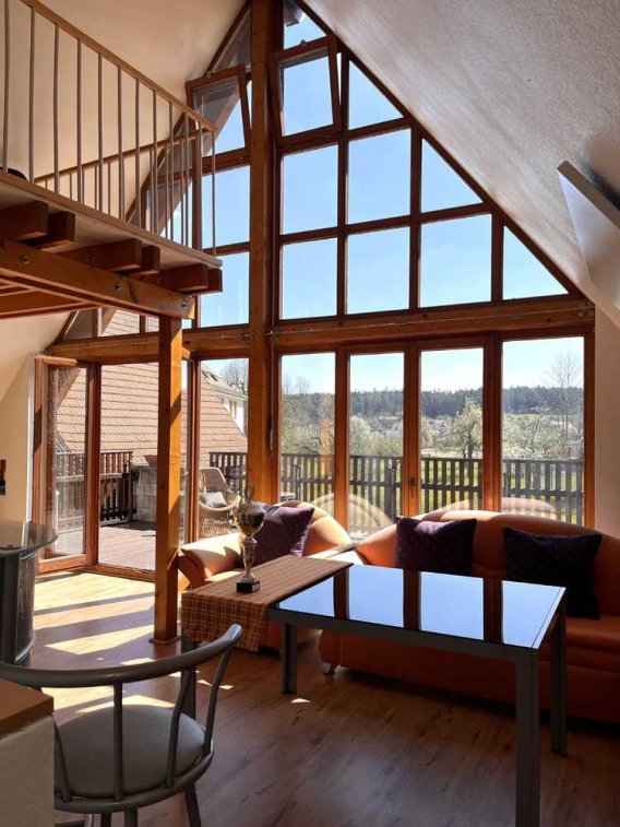Im Obergeschoss befinden sich die sonnige Galeriewohnung mit einer herrlichen Dachterrasse, 1 Schlafzimmer und Badezimmer, teils mit offenem Gebälk und typischen Fachwerk-Details – ein echter Hingucker für Liebhaber des traditionellen Baustils.