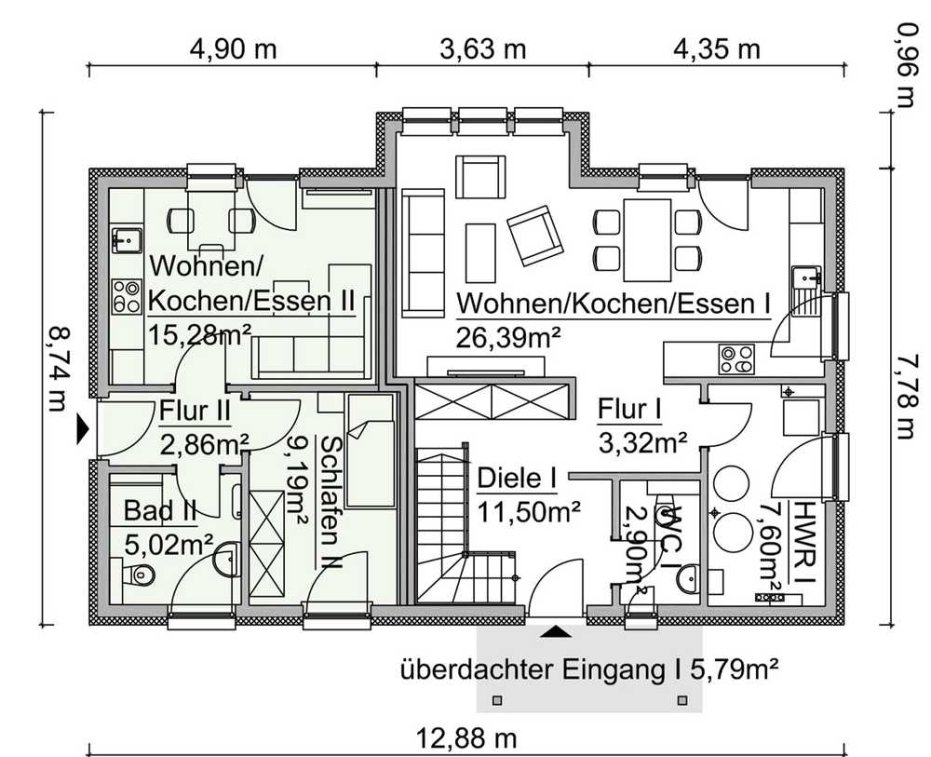 Die geplante innere Aufteilung können Sie den Grundrissen entnehmen. Diese sind selbstverständlich auf Ihre persönlichen Wünsche anpassbar. – Lassen Sie sich einfach mal beraten und Sie werden sich wundern was alles möglich ist.