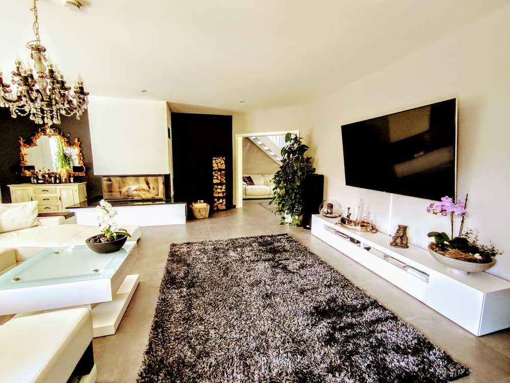Sechs Meter Fensterwände sorgen hier für Licht und Leichtigkeit. Der Ausblick in den Garten ist gigantisch. Der stilvolle Steinboden und der riesige Kamin von Brunner versprechen Eleganz und Gemütlichkeit.