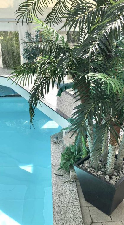 Luxuriöses Schwimmbad mit Granitumrandung, Brücke, Sitz- und Liegefläche sowie Wasserfall und Springbrunnen im Schwimmbad. UV-Sand Filteranlage, Salzwasser geeignet. Automatisch gesteuerte Sonnen solar Heizung, sowie über Hackgut.