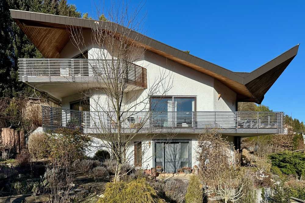 Ein umlaufender Balkon auf der zweiten Ebene eröffnet einen fantastischen Panoramablick, eine Sonnenterrasse mit Markise und ein liebevoll angelegter Gartenteich machen das Leben im Freien zum Genuss. Im Gartengeschoss lädt der großzügig angelegte Garten mit Bepflanzung auf verschiedenen Ebenen und einem praktischen Gartenhaus zum Entspannen oder geselligen Beisammensein ein. Die neu angelegte Steinmauer unterstreicht den gepflegten Gesamteindruck.