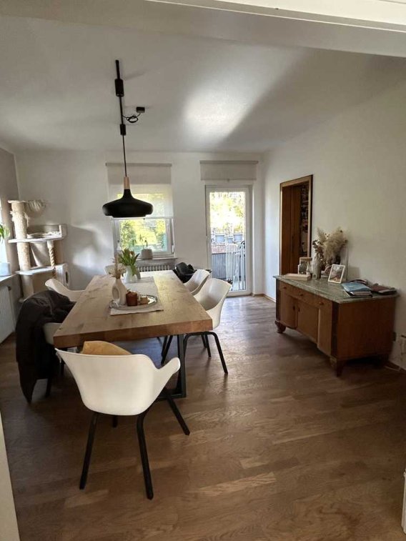 Raumaufteilung: Flur, Wohnzimmer mit Kaminofen, Esszimmer mit Zugang zum Balkon und zur Terrasse, welche über einen Eisengittersteg zu erreichen ist, Kochküche (die Einbauküche ist im Kaufpreis enthalten), Badezimmer mit Badewanne und Dusche, 3 Schlafzimmer, Gäste-WC.