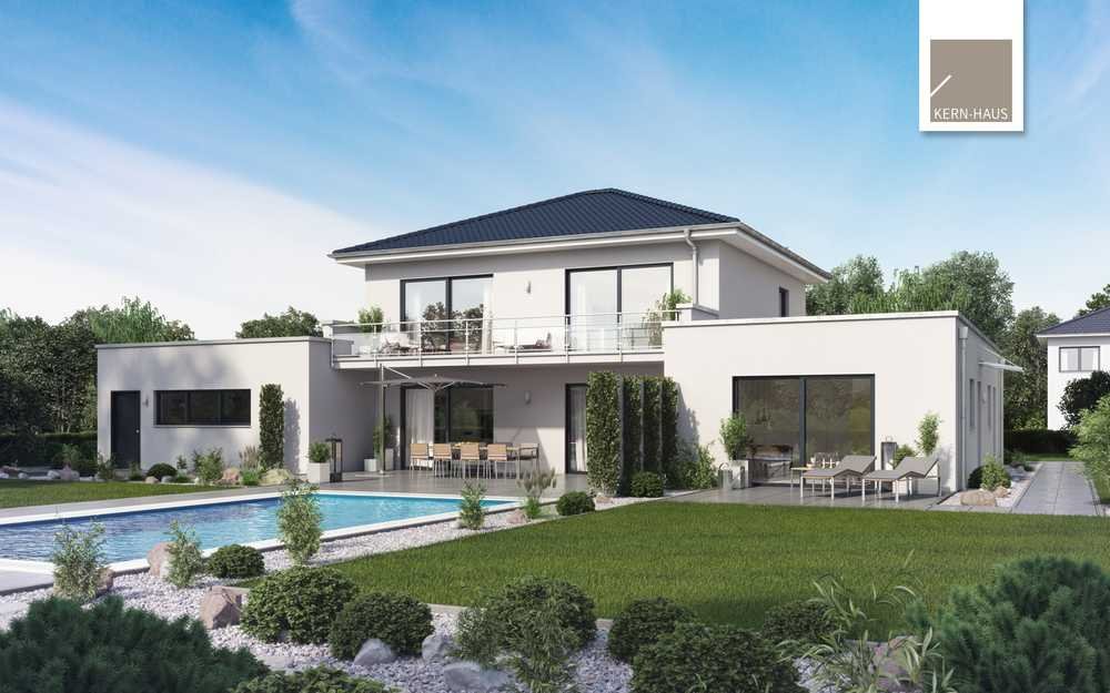 Beim Mehrgenerationenhaus Vivaro trifft eine exklusive Stadtvilla auf moderne Bauhaus-Architektur. Die Stadtvilla verfügt über vier Zimmer auf rund 165 Quadratmetern. Bereits in der Diele haben Sie durch eine Glastür Blick in den offenen Wohn-und Essbereich mit Küche. Vom Wohn- und Esszimmer können Sie über bodentiefe Fenster hinaus in den Garten gehen und sitzen dank überdachter Terrasse auch bei Regen trocken. Der Hauswirtschaftsraum bietet einen direkten Zugang in die Doppelgarage. Im Obergeschoss befinden sich ein Kinderzimmer, ein Elternschlafzimmer mit Ankleide, das ebenso wie das Kinderzimmer einen Zugang auf den Balkon hat, ein Home-Office und ein Badezimmer. Zum Mehrgenerationenhaus wird die Stadtvilla Vivaro durch seine moderne Einliegerwohnung als Anbau im Bauhausstil. Diese verfügt über einen großzügigen Wohn- und Essbereich, ein Badezimmer sowie ein Schlafzimmer.