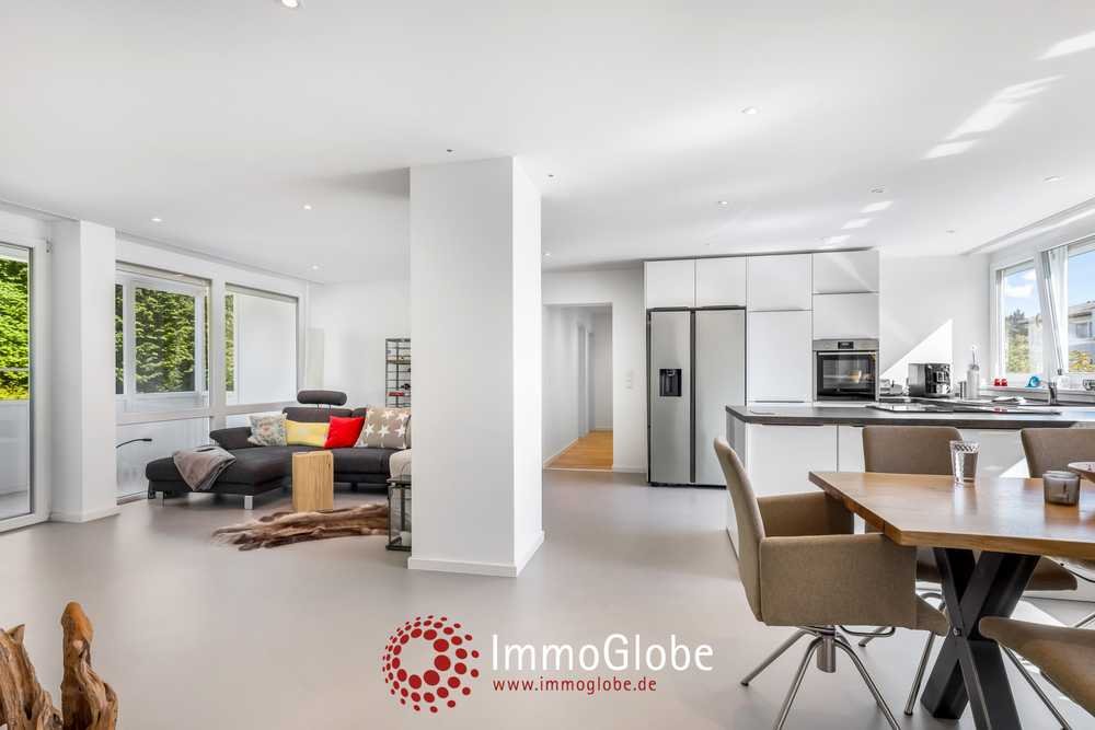 Die 3,5-Zimmer-Wohnung besticht durch einen großen, lichtdurchfluteten Wohn-Essbereich mit integrierter Küche. Dieser offen gestaltete Bereich bildet das Herzstück der Wohnung und bietet durch die großzügige Fensterfront einen herrlichen Blick ins Grüne – besonders von der angrenzenden Loggia aus, die zum Verweilen einlädt.