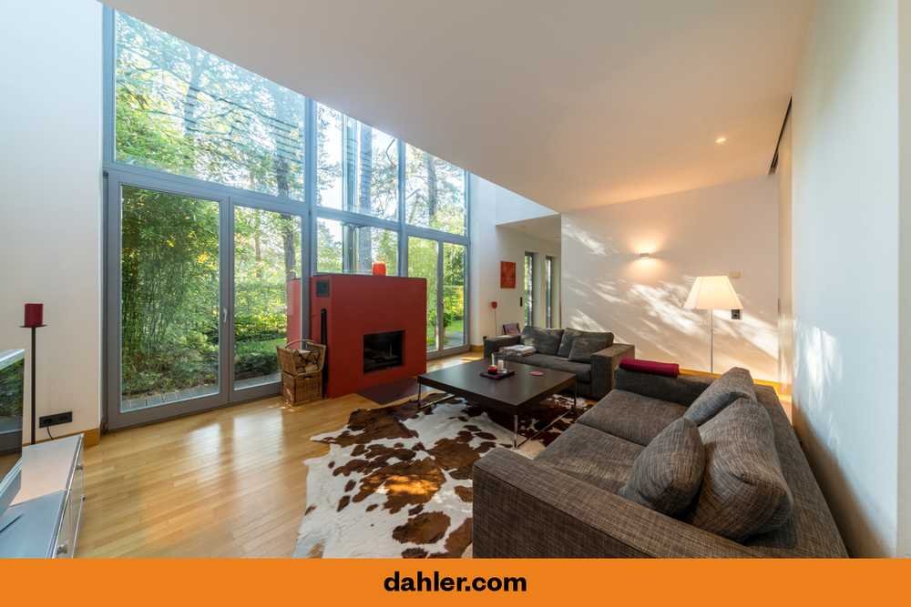 In 2000, this elegant architect-designed house with a living area of approx. 284 m² and further usable area of approx. 140 m² was built in a very desirable location on a south-west plot of approx. 920 m². The spacious grounds - the neighboring area is undeveloped - and the old tree population provide a lot of privacy in the well-kept garden and pool area.