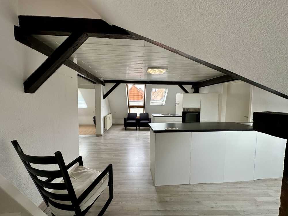 Die Wohn-Küche bildet den zentralen Mittelpunkt der Wohnung. Das Herzstück ist die moderne Küchenzeile eingerahmt von Fachwerkbalken. Eine Vielzahl von Dachfenstern verschaffen diesem Raum eine besondere Lichtflut. Der Wohn-Essbereich lädt zum Verweilen ein. Von hier aus erreicht man zentral alle Räume.