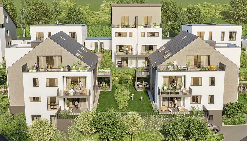 Das Gebäude wird in solider Mauerwerksbauweise errichtet und erfüllt alle Anforderungen gemäß GEG 2024. Fundamente und Bodenplatte in Beton. Die Außenwände sowie die tragenden Innenwände werden aus Kalksandstein bzw. Stahlbeton hergestellt. Die Geschossdecken bestehen aus Stahlbeton. Die Geschosstreppen sind ebenfalls aus Stahlbeton gefertigt. Sie werden mit polierten Granitstufen belegt. Auf das Außenmauerwerk wird ein Wärmedämmverbundsystem (WDVS) aufgebracht.