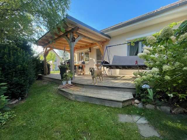 Auf den 611 Quadratmetern des Grundstücks können Sie ganz ungestört Ihren Wünschen nachgehen. Die gemütliche Terrasse mit Blick auf Feld und Flur und dennoch sichtgeschützt, lädt zum Ruhen ein, überdacht von einem wunderschönen, massiv gebauten Dach sind Sie hier vor Wind und Wetter geschützt - auch ein seichter Sommerregen lässt den Grillabend hier nicht ins Wasser fallen.