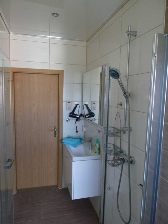 - Bad mit großzügiger, barrierefreier Dusche, WC und Waschbecken