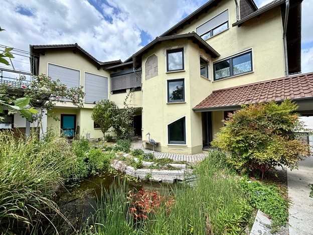 Der liebevoll angelegte Garten mit Naturteich bietet eine grüne Oase der Ruhe. Mehrere Terrassenbereiche, ein überdachter Sitzplatz im Innenhof und großzügige Fensterflächen schaffen eine harmonische Verbindung von Innen- und Außenbereich.