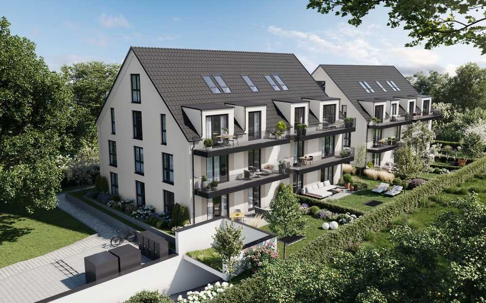 In zwei elegant gestalteten Mehrfamilienhäusern entstehen 14 exklusive Eigentumswohnungen, verteilt auf flexible Grundrisse mit 2 bis 5 Zimmern und Wohnflächen von ca. 48 m² bis 150 m².