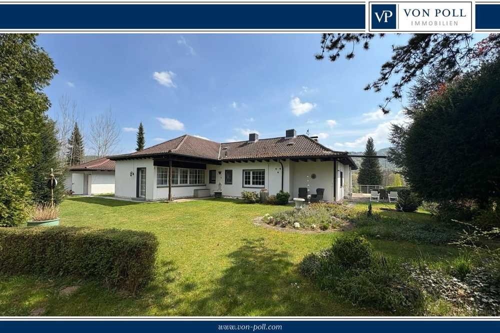 Dieser schöne Winkelbungalow wurde 1956 in Massivbauweise auf einem 2.914 m² großem Grundstück in ruhiger Alleinlage errichtet und in den 60er Jahren erweitert.