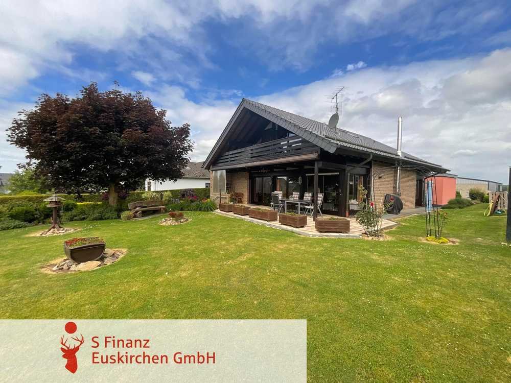 Das Hauptgebäude wurde 1993 in hochwertiger Feldbrandstein-Verklinkerung errichtet und verströmt mit seinen sichtbaren Holzbalken, rustikalen Elementen und dem offenen Grundriss im Erdgeschoss einen unverwechselbaren Landhauscharme. Großflächige Panoramafenster sorgen für ein helles und freundliches Ambiente und bieten direkten Zugang zur großzügigen Terrasse mit atemberaubender Aussicht. Auf rund 152,80 m² Wohnfläche stehen Ihnen im Erdgeschoss ein großzügiger Wohn- und Essbereich mit Kamin, die Küche sowie ein separates Duschbad zur Verfügung. Im Dachgeschoss befinden sich zwei bis drei Schlafzimmer – jeweils an den Giebelseiten gelegen – mit Zugang zu den angrenzenden Balkonen sowie ein Badezimmer mit Badewanne und Dusche. Alle Fenster sind mit elektrischen Aluminium-Rollläden ausgestattet. Das Haus ist voll unterkellert und verfügt über eine integrierte Garage mit direktem Zugang zum Wohnbereich.