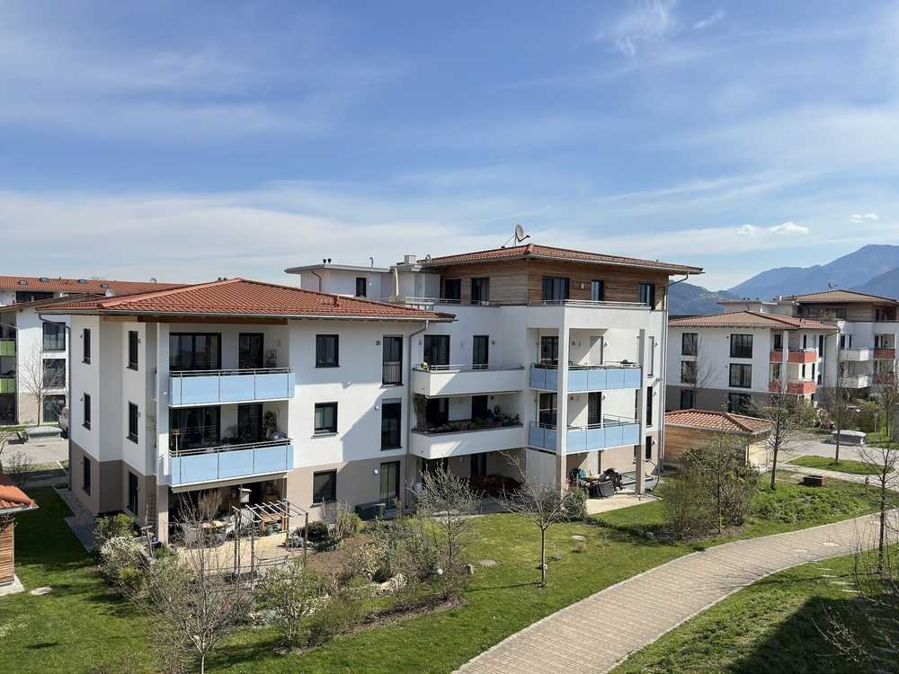 Der großzügige Balkon mit südlicher Ausrichtung lädt zum gemütlichen Verweilen ein - Sie haben einen Blick in das freundlich gestaltete Umfeld der Wohnanlage mit seinen grünen Flächen und Gärtchen sowie die umliegenden Berge des Inntals - Bergblick bis zum Kaiser- und Wendelsteingebirge inklusiv.