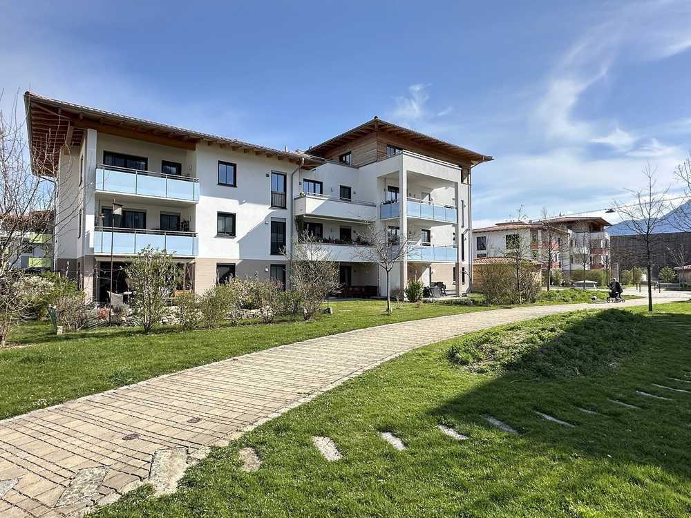 Der großzügige Balkon mit südlicher Ausrichtung lädt zum gemütlichen Verweilen ein - Sie haben einen Blick in das freundlich gestaltete Umfeld der Wohnanlage mit seinen grünen Flächen und Gärtchen sowie die umliegenden Berge des Inntals - Bergblick bis zum Kaiser- und Wendelsteingebirge inklusiv.