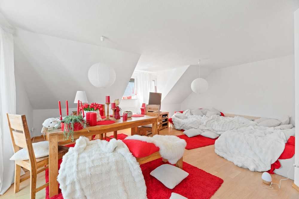 Auf der linken Seite befindet sich das große Tageslichtbadezimmer, das mit einer Dusche, einer Badewanne sowie einem Doppelwaschbecken ausgestattet ist – ideal für den täglichen Komfort. Direkt anschließend erreichen Sie das helle Schlafzimmer, das trotz der Dachschrägen viel Platz für ein großes Bett und einen Kleiderschrank bietet und eine angenehme Rückzugsatmosphäre schafft.