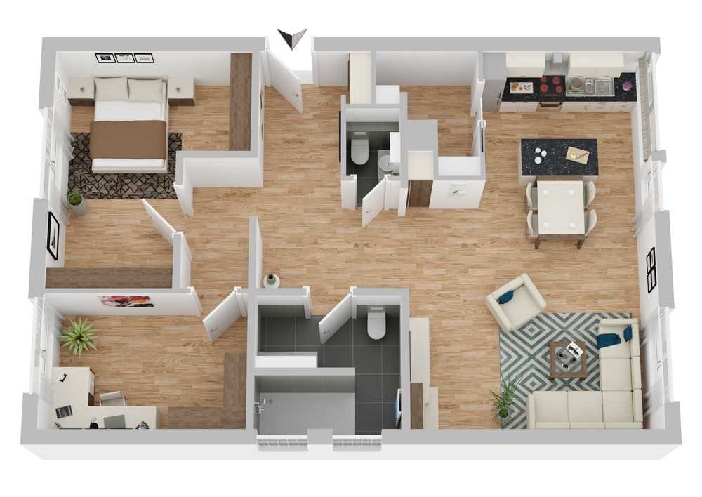 Die Erdgeschosswohnung verfügt über eine zeitgemäße und moderne Raumaufteilung. Ein großes Wohn- und Esszimmer mit offener Küche incl. Vorbereitung für eine Kochinsel sowie einen der Küche angegliederten Hauswirtschaftsraum, zwei Schlafzimmer, ein Gäste-WC und ein exklusives Badezimmer mit großer walk-in-Dusche, Waschtisch mit Aufsatzbecken u. a., zeichnen diese Wohnung aus.