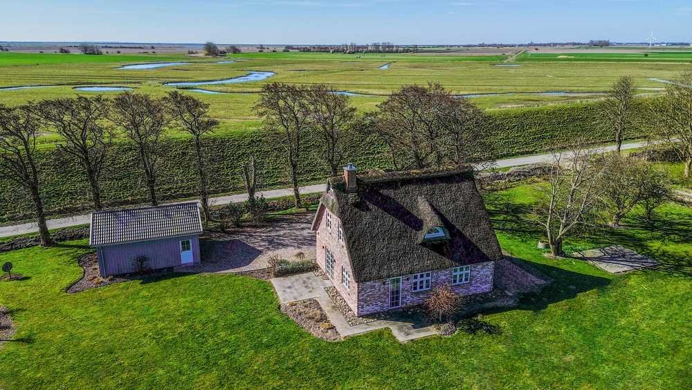 Am Rande der Ortschaft Wöhrden liegt dieses wunderschöne, 2018 erbaute Reetdachhaus. Es steht auf einem ca. 3.921 m² großen Grundstück im Außenbereich der Gemeinde. Eine schmale Straße führt am Deich entlang zu diesem Schmuckstück, das sich hinter Bäumen versteckt und erst zeigt, wenn Sie die Kiesauffahrt bereits erreicht haben. Der hübsche Klinkerstein harmoniert perfekt mit dem Reetdach und den weißen, 3-fach verglasten Sprossen-fenstern, die sich nach dänischem Vorbild nach außen öffnen. Im Eingangsbereich empfängt Sie der Flur, an dessen linkem Ende der Hauptschlafraum und ein Duschbad en Suite liegen. Rechts mündet der Flur in den Wohn- und Essbereich mit Kaminofen und offener Landhausküche. Die nach Südost ausgerichtete Terrasse betreten Sie über den Wohnraum. Essbereich und Küche verfügen über einen eigenen Zugang zum Garten. Im Erdgeschoss befinden sich außerdem ein großzügiges Gäste-WC sowie ein Abstellraum unter der Treppe, die vom Eingang in das Dachgeschoss führt. Am Ende der Treppe erwartet Sie zunächst ein sehr gemütlicher Sitzplatz auf der Galerie. Diese Ebene beherbergt außerdem zwei licht-durchflutete Zimmer und ein luxuriöses Bad, das sowohl über eine große Walk-In Dusche als auch über eine Badewanne verfügt. Der weite Blick aus dem Fenster der Rundgaube dieses Badezimmers ist atemberaubend. Ein separater Hauswirtschaftsraum schließt sich an das Bad an und komplettiert das Raumangebot dieser Immobilie. Dieses besondere Haus strahlt neben Modernität vor allem Gemütlichkeit aus. Näher betrachtet, bietet es darüber hinaus alle Annehmlichkeiten moderner Baukunst. Die hier verbaute Luftwärmepumpe entspricht dem aktuell bevorzugten Heizungs-standard. Sie speist die Fußbodenheizung und sorgt für ein ausgesprochen angenehmes Raumklima. Jedes Fenster dieses Reetdachhauses bietet einen einzigartigen Weitblick. Im Süden des Grundstücks befindet sich die Garage. Sie bietet Platz für einen Pkw und außerdem zusätzliche Nutzfläche. Lassen Sie sich von der Mikrolage dieses Hauses verzaubern. Erleben Sie die charmante Symbiose aus typisch norddeutschem Baustil und moderner Bautechnik in perfektem Zusammenspiel mit der umgebenden Natur. Der nordwestliche Teil des Grundstücks besticht auf ca. 1.000 m² durch vielfältigen, teilweise alten Baumbestand und der einzigartigen Möglichkeit, ein kleines Gebäude darauf zu errichten, obwohl es im Außenbereich liegt.