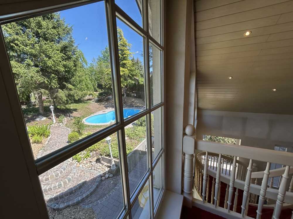 Das Anwesen besteht aus zwei getrennten Wohneinheiten und einer zusätzlichen Einliegerwohnung. Die Haupteinheit mit ca. 201,53 m² Wohnfläche steht derzeit leer und ist sofort bezugsfrei. Sie umfasst vier Schlafzimmer, zwei hochwertige Bäder, großzügige Wohnräume und eine beeindruckende, freitragende Holztreppe im Eingangsbereich – ein maßgefertigtes Meisterstück vom Schreiner im damaligen Wert von 100.000 DM. Ein besonderes Highlight ist der rund 1.400 m² große, parkähnlich angelegte Garten mit Fischteich, eingelassenem Aktivpool, gepflasterten Wegen und römisch gestalteten Balkonen und Säulen – ein Ensemble mit einzigartigem Flair. Fünf Terrassenflächen und große Fensterfronten schaffen helle, offene Wohnatmosphären und erweitern das Leben ins Freie.