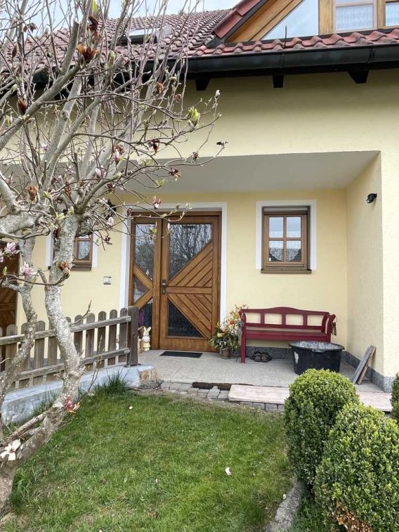 Bereits beim Betreten fällt die harmonische Architektur ins Auge – warme Fassadenfarben, Holzfenster und eine durchdachte Raumaufteilung schaffen eine wohnliche und einladende Atmosphäre.