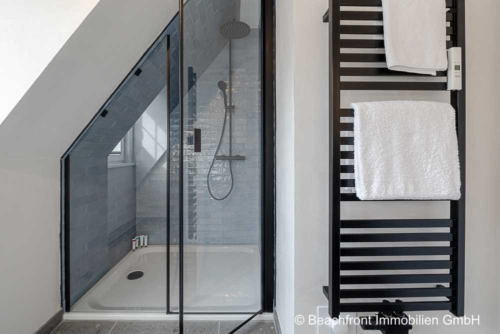 Der offene Wohn- und Essbereich ist hell, funktional und mit einer maßgefertigten Küche, Eichenholzdielen und harmonischer Farbgestaltung hochwertig ausgestattet. Der Balkon erweitert den Raum ins Freie – ein geschützter Ort für entspannte Auszeiten bei frischer Sylter Luft. Ein zusätzlicher Raum im oberen Geschoss ergänzt das Raumangebot unauffällig.