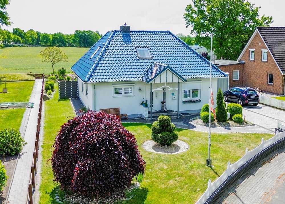 Dieses 1980 erbaute Nordmarkhaus liegt sehr ruhig in einer Sackgasse und ist umgeben von einem gepflegten, ca. 900 m² großen Grundstück. Die Immobilie heißt Sie bereits im Eingangsbereich herzlich willkommen. Von hier aus erschließen sich die weiteren Räumlichkeiten im Erdgeschoss. Das geräumige, lichtdurchflutete Wohn-Esszimmer mit Zugang zum Wintergarten bildet hier den zentralen Mittelpunkt. Die angrenzende Küche ist, typisch für das Baujahr, in einem separaten Raum und wurde 2023 modernisiert. Das barrierearme Duschbad sowie ein Schlafzimmer ergänzen diese Ebene. Im Dachgeschoss befinden sich zwei weitere Zimmer und ein WC. Eine kleine Ausbaureserve bietet hier die Möglichkeit, das WC in ein kleines Duschbad auszubauen. Ein Teilkeller sorgt für ein weiteres Platzangebot. Hier befinden sich sowohl die Anschlüsse für Waschmaschine und Trockner als auch die Ölheizung. Zu dem Objekt zählen weiterhin eine Garage und zwei zusätzliche Außenstellplätze. Die Fenster (3-fach Verglasung) und die Eingangstür wurden 2024 modernisiert. Der Garten wurde liebevoll angelegt und bietet zusammen mit der Südterrasse mit elektrischer Markise einen windgeschützten Rückzugsort. Dieses gepflegte Einfamilienhaus mit ca. 115 m² Wohnfläche überzeugt mit einem durchdachten Grundriss, die ruhige Lage und einen beeindruckenden Weitblick über die Felder.