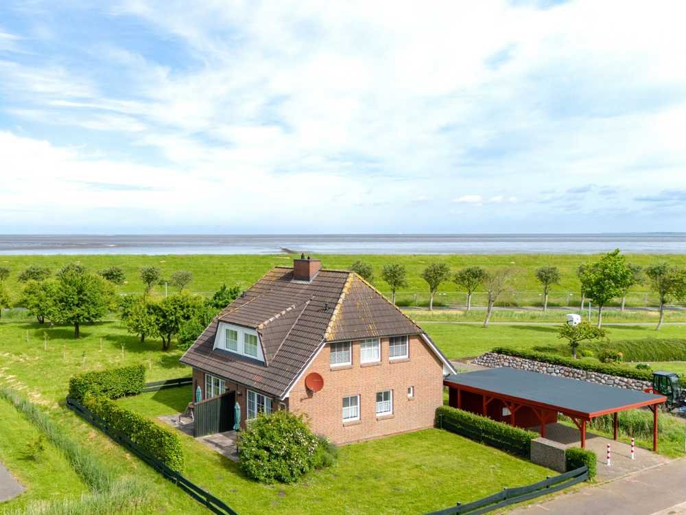 Der Außenbereich ist pflegeleicht gestaltet. Eine großzügige Südterrasse, die jeweils über den Wohn- und Essbereich erreichbar ist, bietet immer einen sonnigen Platz an der guten Nordseeluft. Dieses durchdachte Objekt hat keine direkten Nachbarn und ist mit der eigenen Obstwiese und der Deichlage eine Besonderheit. Ein Doppelcarport mit Gartenhaus runden dieses Angebot ab.